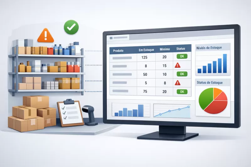 Os alertas de estoque mínimo são recursos estratégicos para evitar rupturas. O sistema informa quando determinado produto atinge um limite crítico, permitindo ações preventivas antes que a falta de mercadoria impacte as vendas.
